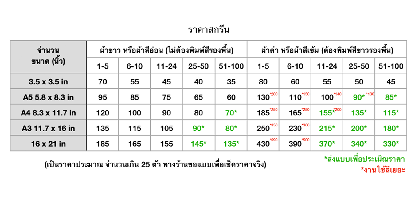 ราคาประเมินจากการใช้น้ำหมึกในการสกรีน และอิงจากในตารางทั้งสองตารางนี้