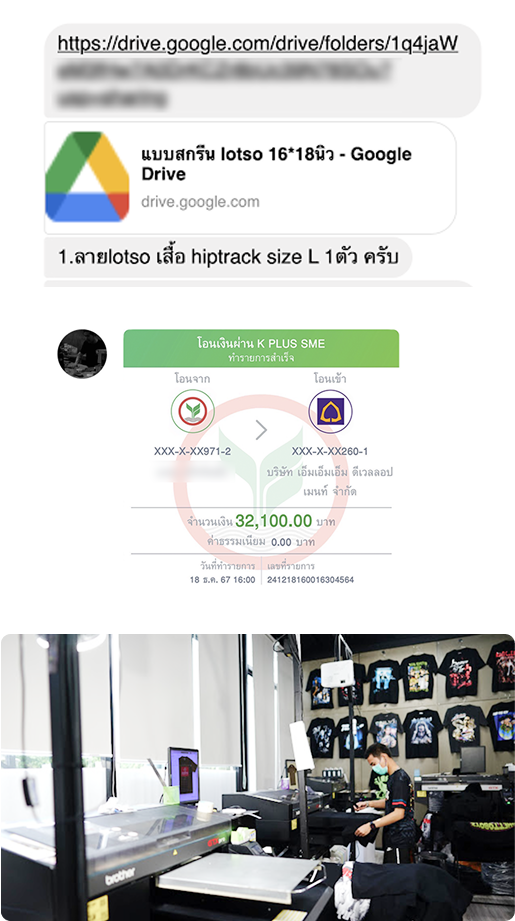เมื่อทำการคุยละเอียดเป็นที่เรียบร้อย ลูกค้าทำการ โอนเงิน / แจ้งสลิบ แอดมินทำการลงคิวสกรีน และช่างสกรีน (ตามลำดับคิว)